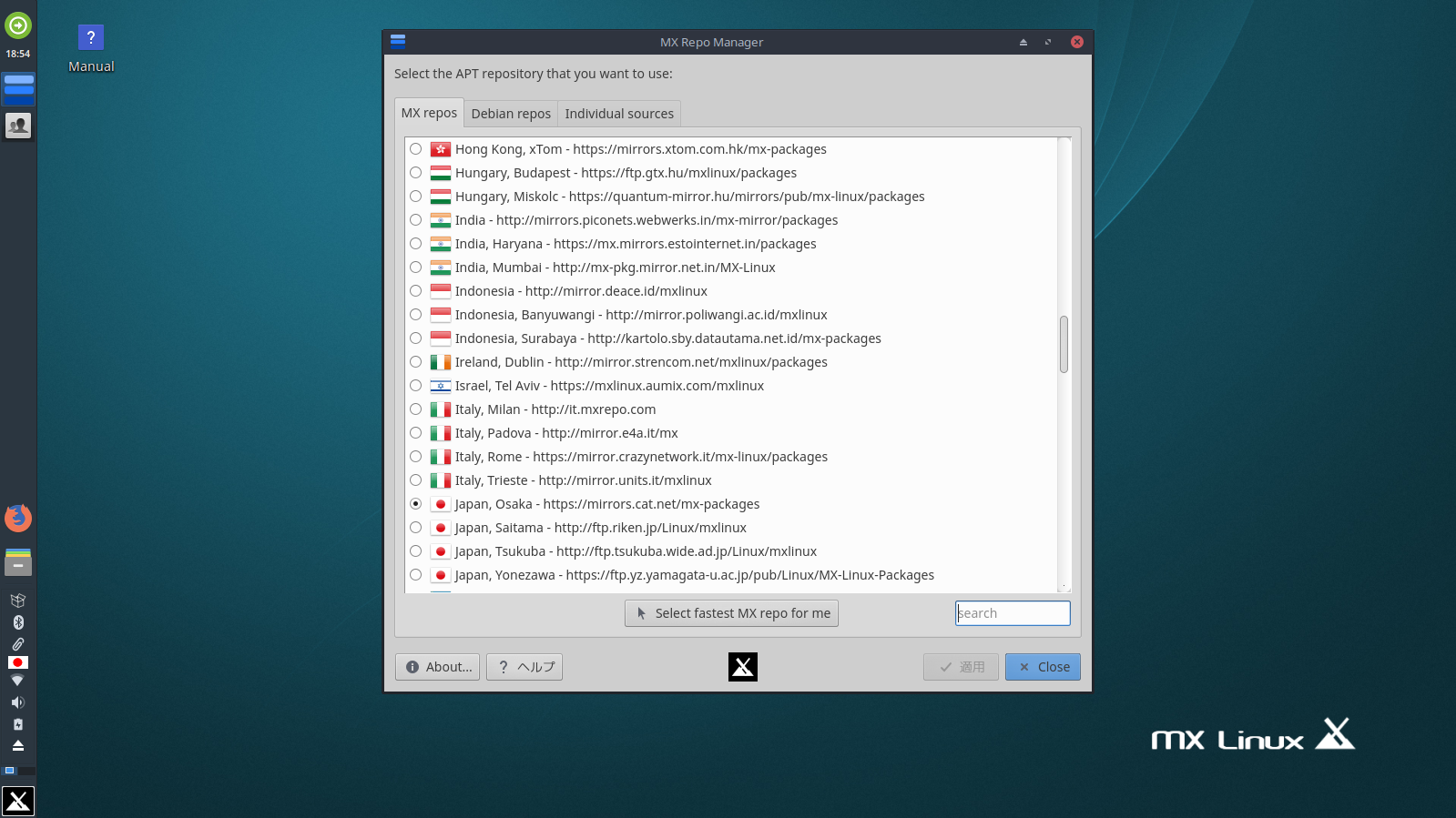 ”インストール”の箇所でlanguageを日本語にセットしてインストールすると、mirrors.cat.netにMX repositoryがセットされますが、これが利用できません。このままだとMXリポジトリに入っているアプリケーション等のアップデートやインストールが行えない状態です。