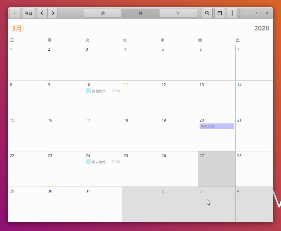 Gnome Calendarを起動します。前回投稿した通り、デフォルトでは、オンラインカレンダーサービスとの連携は取れませんが、gnome control center等を追加インストールすれば、連携可能となります。