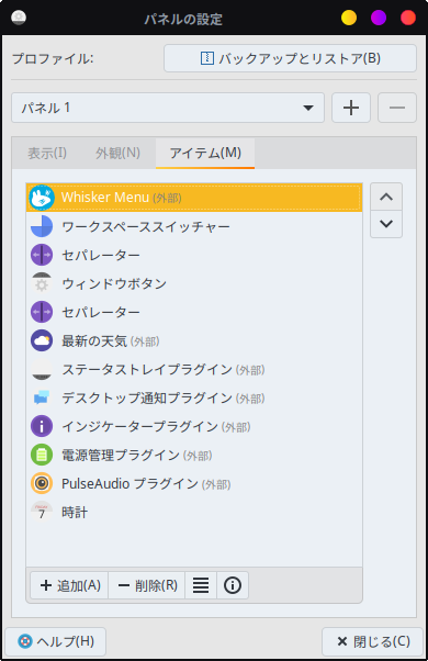 | 筆者はワークスペーススイッチャーの他に天気予報(最新の天気)もアイテムとしてパネルに追加しています。天気予報は、最新の天気のプロパティを使って表示場所、単位等の微調整が必要です。 |
